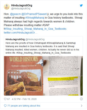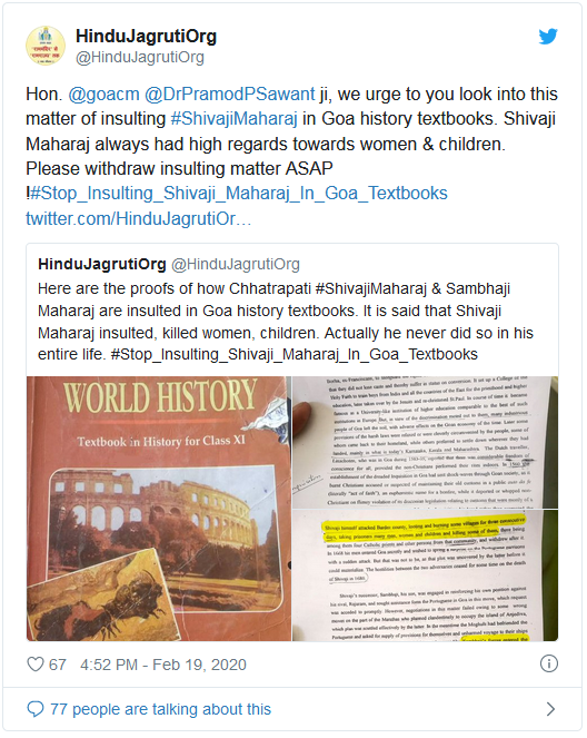 HJS though its twitter handle appeapled Goa CM as , “Hon. @goacm @DrPramodPSawant ji, we urge to you look into this matter of insulting #ShivajiMaharaj in Goa history textbooks. Shivaji Maharaj always had high regards towards women & children. Please withdraw insulting matter ASAP ! #Stop_Insulting_Shivaji_Maharaj_In_Goa_Textbooks.”