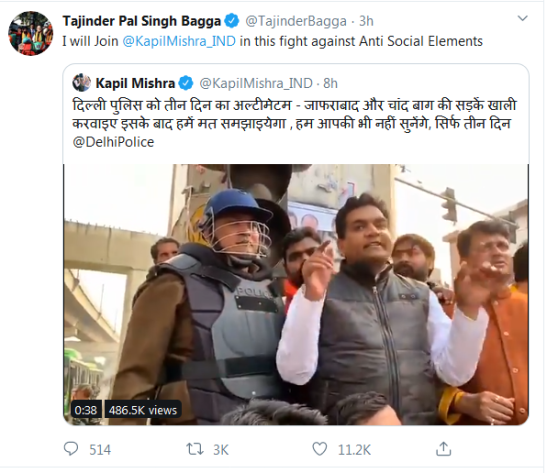 Taking his twitter handle Kapil Mishra wrote, “दिल्ली पुलिस को तीन दिन का अल्टीमेटम – जाफराबाद और चांद बाग की सड़कें खाली करवाइए इसके बाद हमें मत समझाइयेगा , हम आपकी भी नहीं सुनेंगे, सिर्फ तीन दिन@DelhiPolice” — Three Days Ultimatum to Delhi Police. Clear the roads Jaffrabad and Chand Bagh now, Please don’t make any request to us afterwards. We will not even here you (Delhi Police). Only Three Days @DelhiPolice. The Tweet was instantly liked and retweeted by thousands including another BJP firebrand leader of Delhi Tajinder Pal Singh Bagga who invited Waris Pathan for one to one fight at any place+.