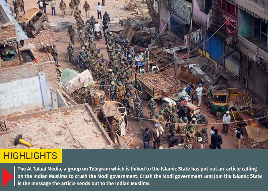 This article comes in the backdrop of various other terror groups using the Delhi riots as a recruitment platform. Groups such as the Lashkar-e-Tayiba and Jaish-e-Mohammad have been circulating images on groups such as WhatsApp, Telegram and DarNet. The message is to all Indian Muslims to take up Jihad and overthrow the existing government.