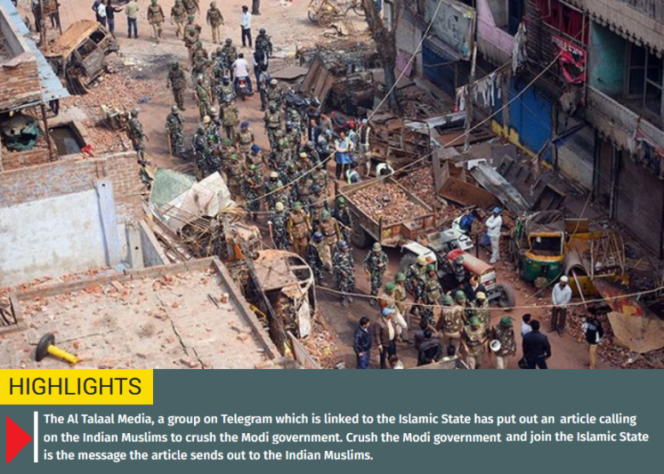 The Al Talaal Media, a group on Telegram which is linked to the Islamic State has put out an article calling on the Indian Muslims to crush the Modi government. Crush the Modi government and join the Islamic State is the message the article sends out to the Indian Muslims.