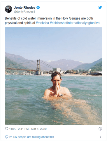HJS Media | Haridwar | March 5, 2020:: Former South African cricketer Jonty Rhodes shared a beautiful picture from his visit to Rishikesh for the International Yog Festival as he got the opportunity to take a dip in the holy Ganga river, reported by Times Now.