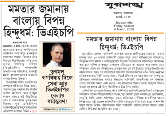 Raising a high alarm for Christian conversion in East Midnapore District, Dr Singha alleged that WB Minister and influential TMC leader Subhendu Adhikary was funding hugely for the construction of Churches in Bhagabanpur, Bhupatinagar, Khejuri, Conati, Egra, Patashpur, Moyna, Mahishadal, Nandigram and Chandipur areas.