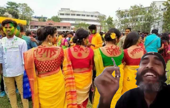 Days ago, Rabindra Bharati University (RBU)’s BT Road campus in north Kolkata witnessed a shocking display of cuss words as vulgar Bengali slangs by a group of young students, who were later identified as outsiders, on their bodies, both boys and girls, while celebrating the annual Basanta Utsav (spring festival) inspired by Bengali cultural icon Rabindranath Tagore whose song they lampooned shockingly.