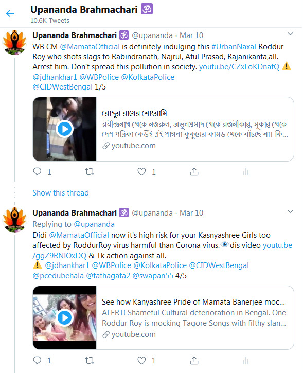 Through a series of tweets, Hindu interlocutor and Hindu Existence Website Editor urged severally WB Governor Jagdeep Dhankar, CM Mamata Banerjee, WB Higher Education Minister Partha Chatterjee, WB Police and Kolkata Police to take initiative to arrest Roddur Roy, yielding no result. Even complaint against Roy in Beliaghata PS could not restrain the youtuber from the filthy flow in his hugely liked social media platform.