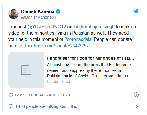 Kaneria, who played 61 Tests & 18 ODIs for Pakistan, took to Twitter to urge his Indian counterparts to do this. He also shared a link through which people can donate to help Pakistan’s minorities+ during this crisis.