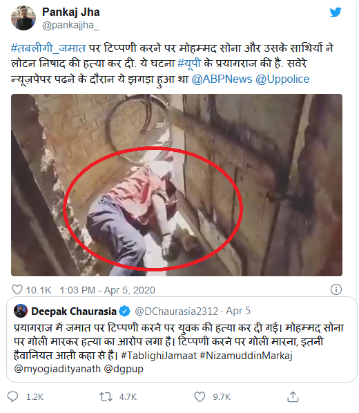 Amit Tripathi | HENB | Prayagraj | April 5, 2020:: On Sunday, a 30-year-old Hindu man named Lotan Nishad was shot dead by one Mohammed Sona in the Bakshi Moda area in Prayagraj in Uttar Pradesh as the deceased accused the Islamic Missionary Movement of Tablighi Jamaat for endangering the lives of other people as the carrier of Covid 19.  Nishad was shot while he sitting at a tea shop and reading a newspaper after having a cup of tea. Nishad died on the spot as other witnessed.