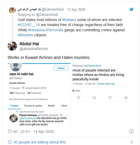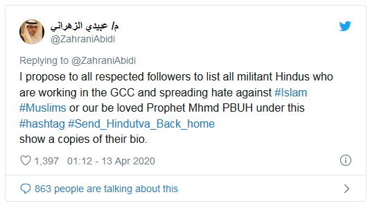 Twitterati could not hold Zahrani per their choice and criticized utterly. In response to his tweet, followers shared screenshots of individuals and groups spreading Hindu supremacist ideology known as Hinduvta from locations in the Middle East or while working for Gulf-based companies. One posted a screenshot of an Indian employee with the caption “Works in Kuwait Airlines and Hates Muslims”. The Hindu extremist had said that, “Most people infected are Mullahs whereas Hindus are living peacefully inside.”