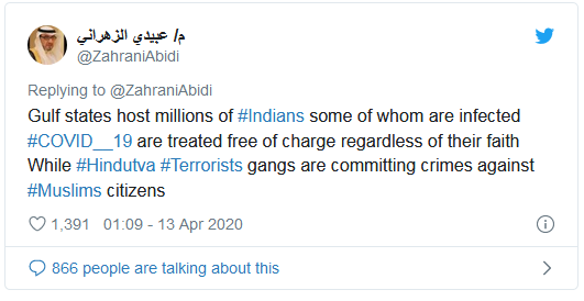 In a separate tweet he added: “Gulf States host millions of #Indians some of whom are infected #COVID__19 are treated free of charge regardless of their faith while #Hindutva #Terrorists gangs are committing crimes against #Muslims citizens.”