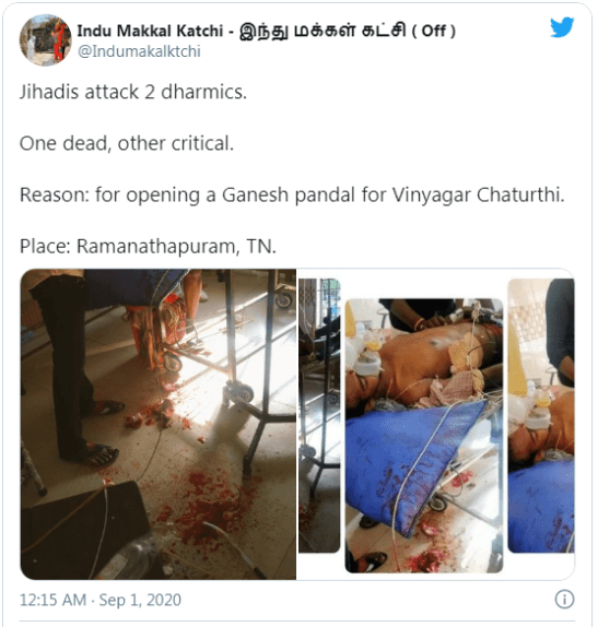 Ravi Sampath | HENB | Ramanathapuram | Sept 1. 2020:: In yet another attack on Hindus in Tamil Nadu, a Ganesha devotee and Hindu activist has been reportedly hacked to death by Jihadi elements on August 31. Arun Prakash (alias Arunkumar), a native of Ramanathapuram is the victim of Jihadi terror spreading across Tamil Nadu.