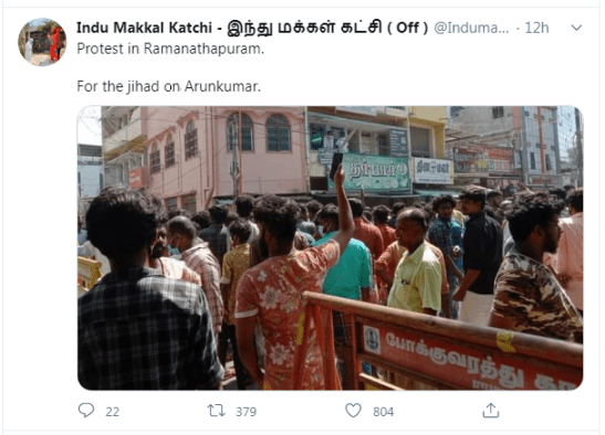 Immediately, after the death of Arun,  Indu (Hindu) Makkal Katchi protested vehemently on the attacks upon Hindu in Ramanathapuram.