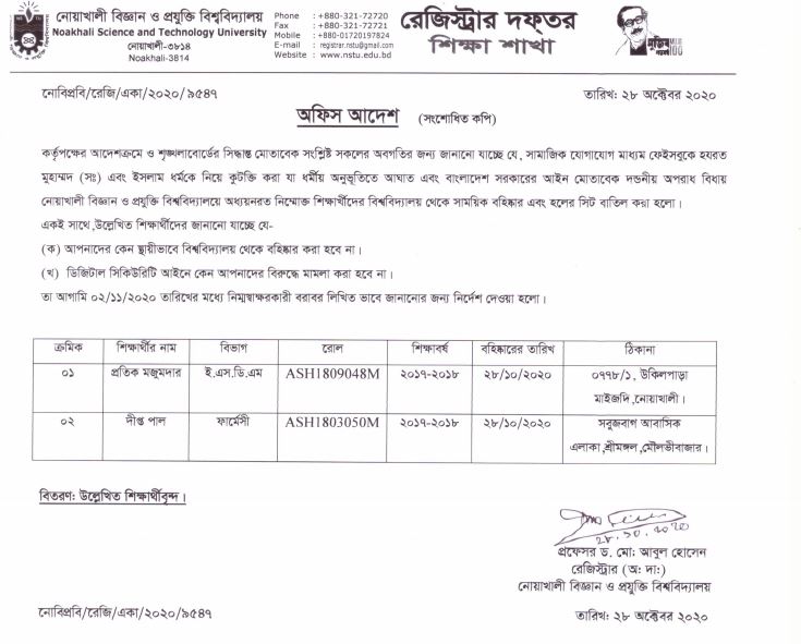 The authorities at Noakhali Science and Technology University (NSTU) has suspended two students for allegedly posting derogatory remarks about Islam and Prophet Muhammad (pbuh).