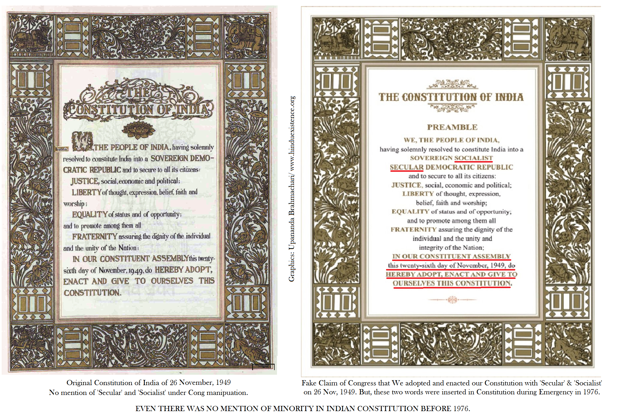 The word ‘Hindu’ is used 6 (Six) times in Indian constitution and the word ‘Hindustani’ used Once. ‘Hindu’ with its cluster identity is clearly mentioned in Constitution including Sikh, Jaina and Buddhist. But, the ‘Muslim’ is used once in the body of Constitution and there is mention of Christian and Arya Samaj so far in Indian Constitution. The word ‘minority was not in the original constitution but included in Constitution far later in 1976 and the ‘Minority’ is used three times there. See details below: