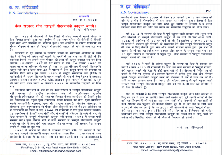 “I would like to have the opportunity to see the ideals for which we all dedicated ourselves to be meaningful with our vision. Hence, while doing the duty of delivering the sentiments of Pujya Saints and gau-bhakts (cow-devotees) to the central government, I am also demanding the central government to earn virtue by making ‘Complete Cow Slaughter Ban Law’ before Gopashtami of 2021 and execute the same nationwide,” Govindacharya expressed his stand through his open letter placed to the Central Govt and the Nation.