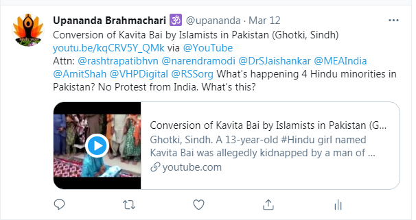 Hindu interlocutor, Upananda Brahmachari protested on pitiable condition of Pakistani Hindus and attracted the attention of PM Modi and Indian External Affairs Minster Jai Shankar through a tweet.