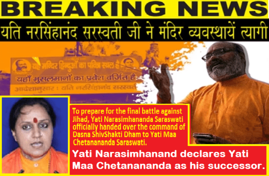 Declaring as his ascetic successor, Yati Narasimhanand Saraswati handed over all his rights and duties of ShivShakti Dham Dasna to Yati Maa Chetanananda Saraswati ji and declared her as the chief abbot of the temple so that there would be no disruption in the development and arrangement of ShivShakti Dham Dasna after his death or during his final battle against Jihad.