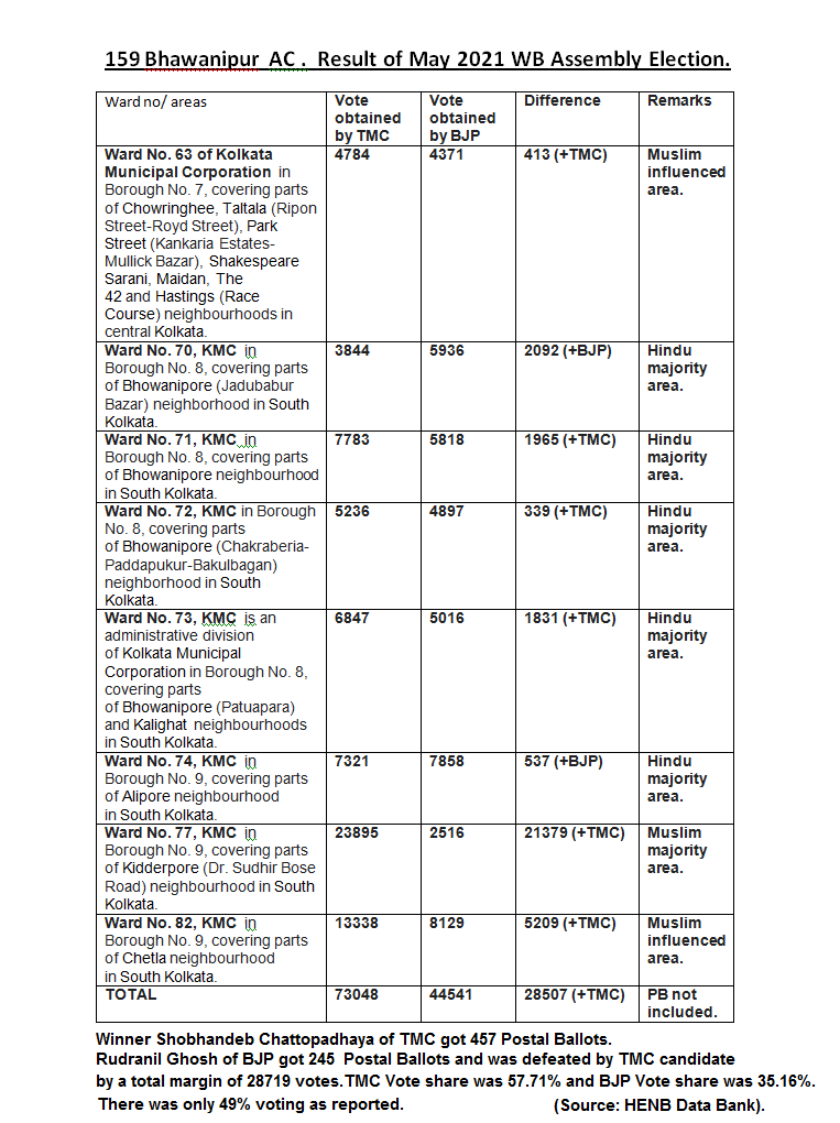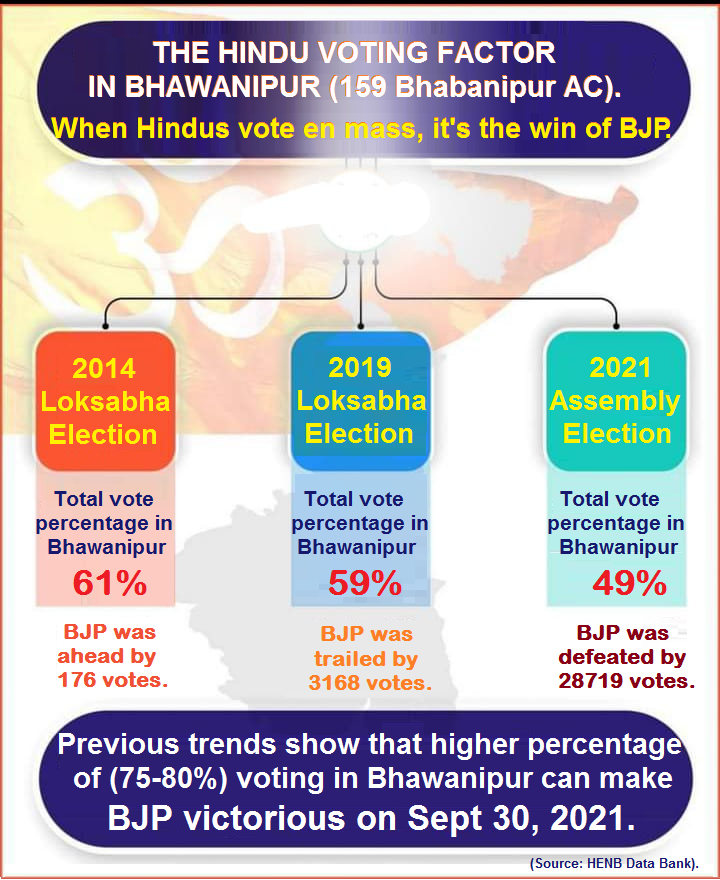 Bhawanipur comprising KMC (Kolkata Municipal Corporation) ward nos 63, 70, 71, 72, 73, 74, 77 and 82 has a mixed population of 35% of Gujarati, Marwari, Sikh, Bihari and Oriya population; 40% Bengali population and 25% Muslim population approximately. The crucial by election as scheduled on 30 September, the Bhawanipur voters are ready to franchise their democratic rights on the issues of imagery developments of local areas, syndicate & hooligan raj, unemployment, corruption & nepotism, blatant minority appeasement and obviously, post poll violence in West Bengal.