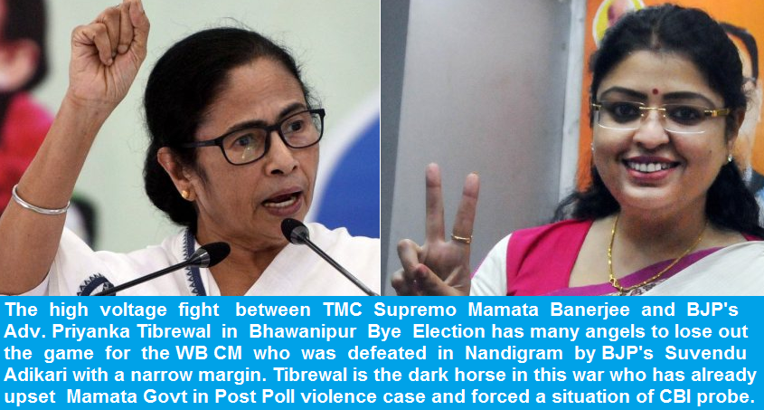 Sulochana Banerjee | HENB | Kolkata | Sept 17, 2021:: The high voltage fight between TMC Supremo Mamata Banerjee and BJP’s Adv. Priyanka Tibrewal in Bhawanipur (159 Bhabanipur Assemble Constituency) By Election has many angels to lose out the game for the WB CM who was defeated in Nandigram by BJP’s Suvendu Adikari with a narrow margin on May 2, 2021. Tibrewal is the dark horse in this war who has already upset Mamata Govt in Post Poll violence case in Calcutta High Court and forced a situation of CBI probe on this.