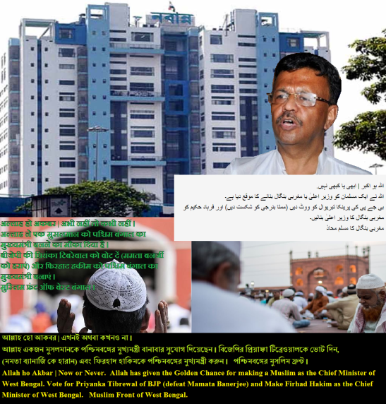 Some social media campaigners are in confusion whether a Muslim Front of West Bengal preaches, “Allah ho Akbar | Now or Never. Allah has given the chance for making a Muslim as the Chief Minister or West Bengal. Vote for Priyanka Tibrewal of BJP (defeat Mamata Banerjee) and Make Firhad Hakim as the Chief Minister of West Bengal” or it’s a funny creation of a social media content maker! But, many Muslim Organisations stood for Firhad Hakim when he described his area as ‘Mini-Pakistan’ in an interview with Pakistani News paper.