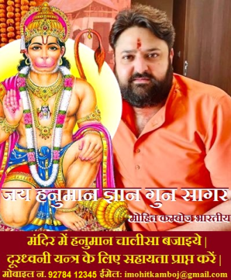 Interested temple committee members may contact Mohit Kamboj in his mobile nos. 8691866666/ 9278412345 or in his Email ID: imohitkamboj@gmail.com for the getting assistance to install loudspeakers in temples to play Hanuman Chalisha.