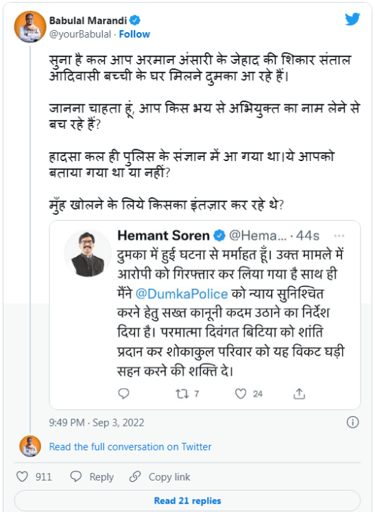 In another tweet Marandi wrote to Soren: “Heard that you are coming to Dumka to meet the family of Santal tribal girl who is a victim of Arman Ansari’s jihad. I want to know, from whose fear, you are not taking the name of the accused? The incident came to the attention of the police yesterday. Was it told to you or not? Who were you waiting for to open your mouth?”