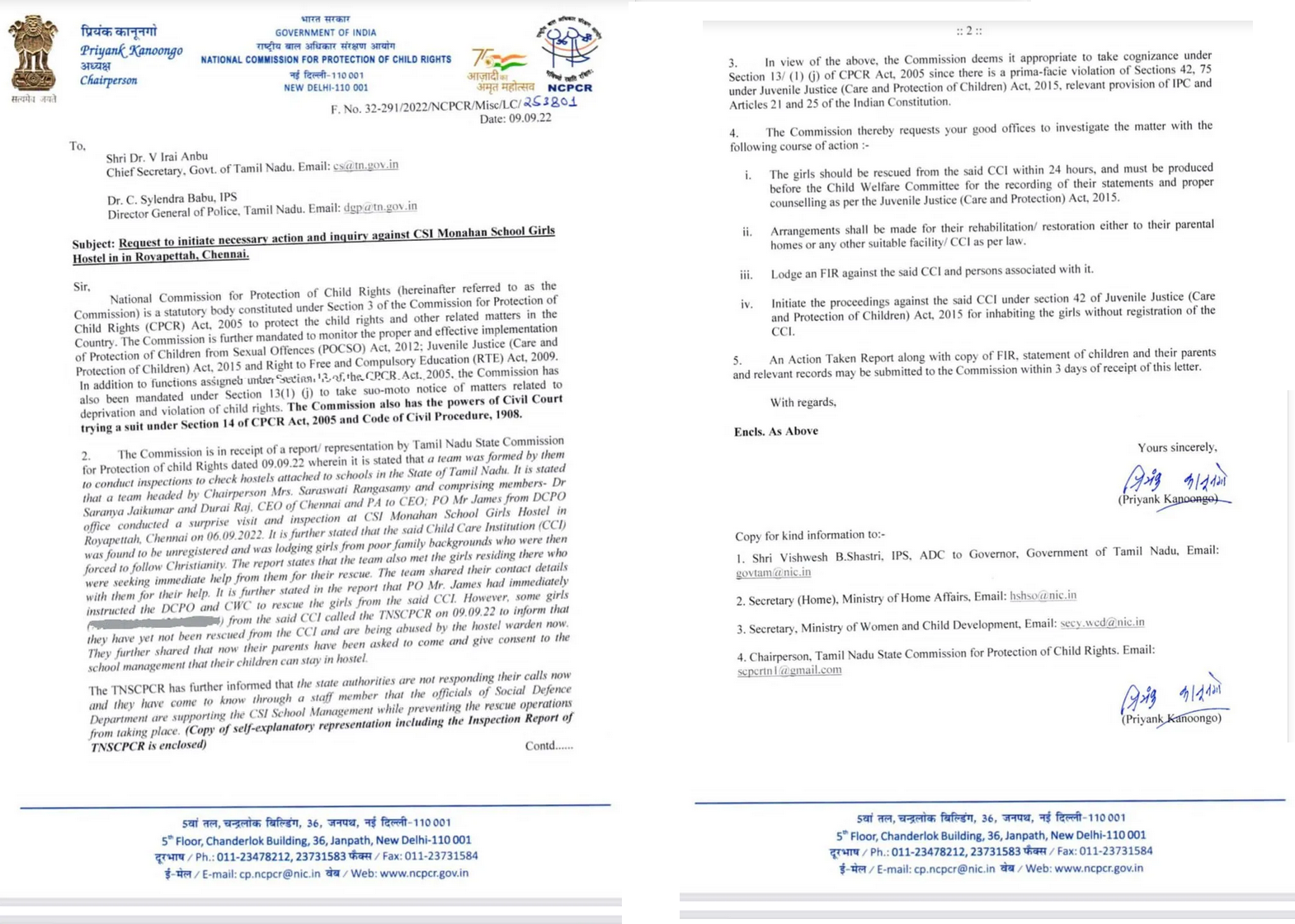 NCPCR Chairman Priyank Kanoongo in his letter has asked the Chief Secretary of Tamil Nadu V Irai Anbu to evacuate inmates of a Christina school hostel within 24 hours. The letter by the NCPCR chairman comes after the Chairman of the State Commission for Protection of Child Rights (SCPCR) and other members of the commission paid a surprise visit to check hostels attached to CSI Monahan Girls Higher Secondary School on September 6.