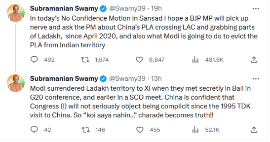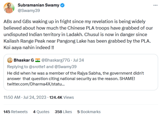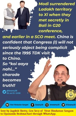 Last of all, Dr Swamy alleged the surrender of PM Modi to his Chinese counterpart Premier Xi Jinping: “Modi surrendered Ladakh territory to Xi when they met secretly in Bali in G20 conference, and earlier in a SCO meet. China is confident that Congress (I) will not seriously object to being complicit since the 1995 TDK visit to China. So “koi aaya nahin…” charade becomes truth!!“