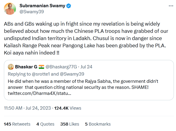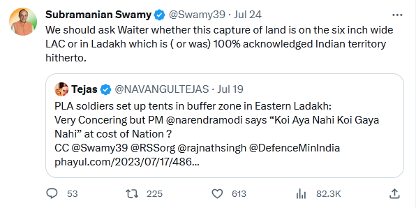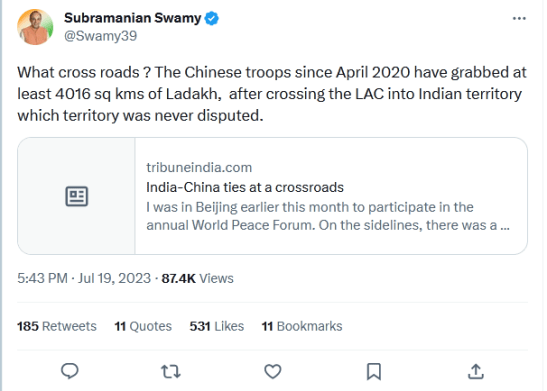 Subsequently, Dr Swamy tweeted, “What cross roads ? The Chinese troops since April 2020 have grabbed at least 4016 sq kms of Ladakh, after crossing the LAC into Indian territory which territory was never disputed.” (on July 19) tagging an article of Tribune India under the headline: India-China ties at a crossroads.