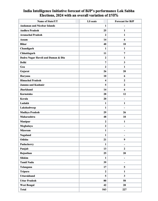 The India Intelligence Initiative conducted a survey (held before 19.04.2024) with the help of some ‘official inputs’ which predicts that BJP will get 227 seats as much in this Lok Sabha election with an overall ± 10% variation. This prediction indicated a maximum 250 seats anyway for BJP. This survey is alarming if it is not an I.N.D.I.A deep fake.