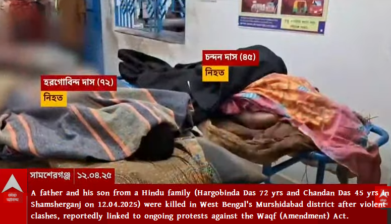 A father and his son from a Hindu family (Hargobinda Das 72 yrs and Chandan Das 45 yrs in Shamsherganj on 12.04.2025) were killed in West Bengal’s Murshidabad district after violent clashes, reportedly linked to ongoing protests against the Waqf (Amendment) Act.