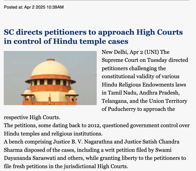 In 2012, Swami Dayananda Saraswati (deceased in 2015) filed a writ petition in the Supreme Court challenging the constitutional validity of laws enabling state control over Hindu temples, their lands, and income. The petition argued that these laws violate Articles 14 (equality before the law), 15 (non-discrimination), 25 (freedom of religion), and 26 (religious autonomy) of the Constitution, as Hindu temples face state interference while mosques, churches, and other minority religious institutions remain largely autonomous. Despite raising critical questions about religious autonomy, the case remained pending for 13 years. In February 2025, the Supreme Court disposed of the petition, directing petitioners to approach High Courts without addressing the substantive issues or granting relief.