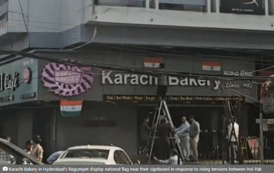 B Upendran | HENB | Hyderabad | May 7, 2025:: Hyderabad’s popular Karachi Bakery has come under scrutiny from right-wing groups due to its name, which has sparked controversy amid heightened tensions between India and Pakistan after ‘Operation Sindoor’ following the Pahalgam terror attack. In a bid to ward off backlash, the bakery has put up the Indian Tricolour on its signage in some of its outlets in the city.