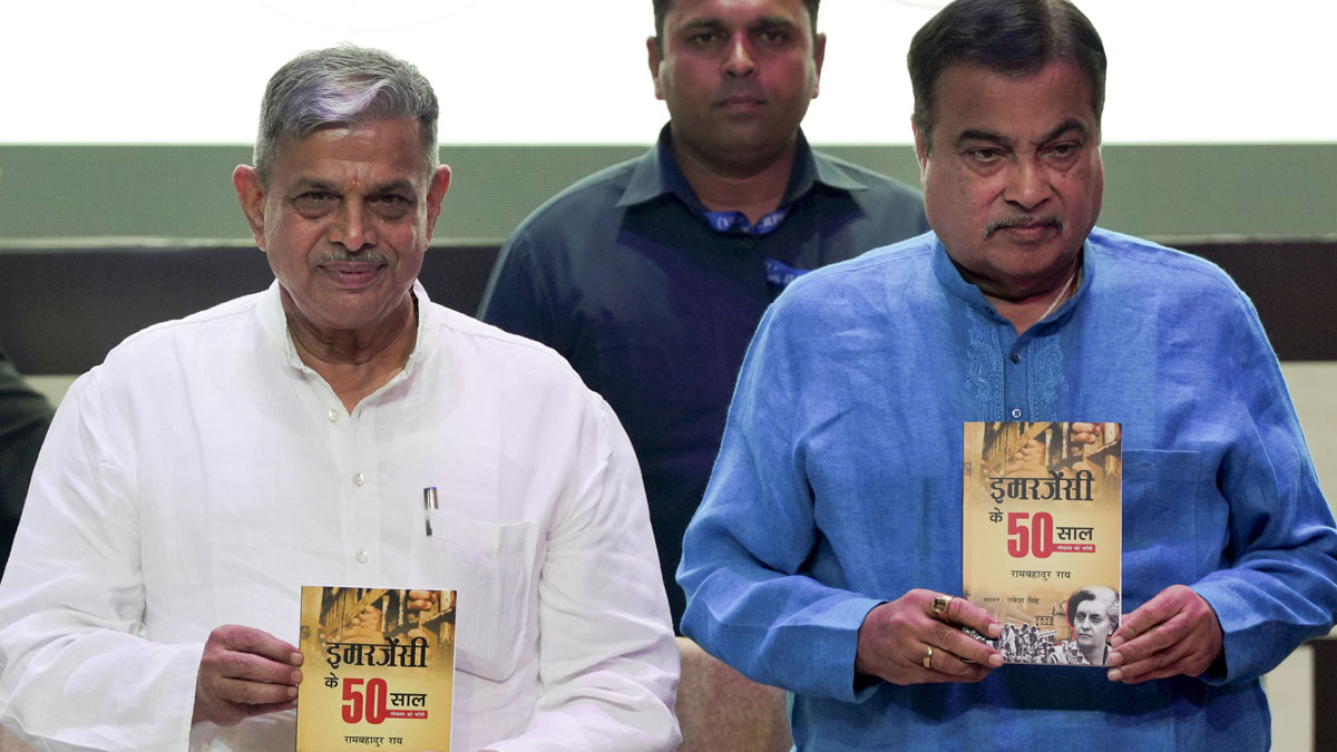 New Delhi: Union Minister of Road Transport and Highways Nitin Gadkari with RSS Sarkaryavah Dattatreya Hosabale releases a book authored by Ram Bahadur Rai during an event to mark the 50th anniversary of the Emergency imposed in 1975, in New Delhi, Thursday, June 26, 2025. (PTI Photo/Atul Yadav)