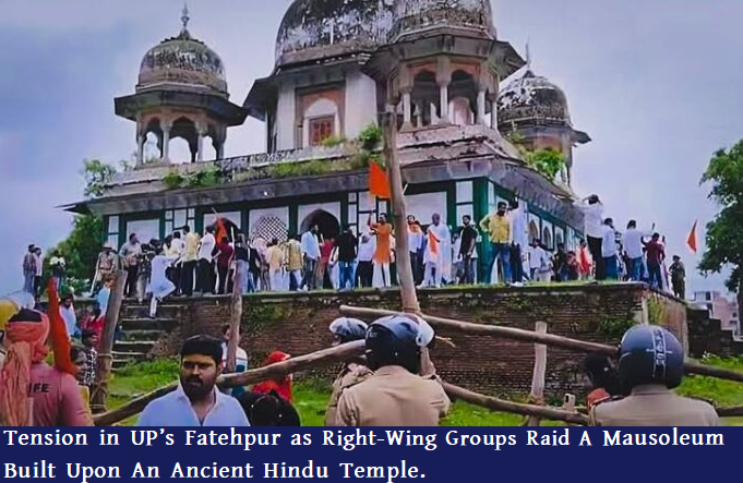 Upendra Bharti | HENB Lucknow | Aug 12, 2025:: A disturbing incident of communal tension unfolded in Uttar Pradesh’s Fatehpur district on Monday, August 11, 2025, when members of Hindu right-wing groups, including the Bajrang Dal and Vishwa Hindu Parishad, vandalized the tomb of Nawab Abdul Samad Khan. The mob claimed that the structure was built over a thousand-year-old temple dedicated to Thakurji and Lord Shiva, sparking widespread controversy and violence.