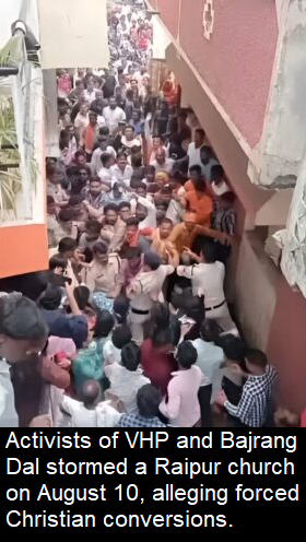 Upendra Bharti | HENB | Raipur (Chhattisgarh) | Aug 16, 2025:: In a disturbing incident that has sparked outrage and concern over religious tensions in the region, members of right-wing Hindutva organizations Vishva Hindu Parishad (VHP) and Bajrang Dal stormed into a church in Raipur, Chhattisgarh. The mob accused Christian community members of “forced conversions” and attempted to halt alleged “false healing and evangelist activities”. The confrontation turned violent, with reports of vandalism, alleged attacks on Christian preachers, and intimidation of worshippers who tried to abuse Hindu Gods and Goddesses.
