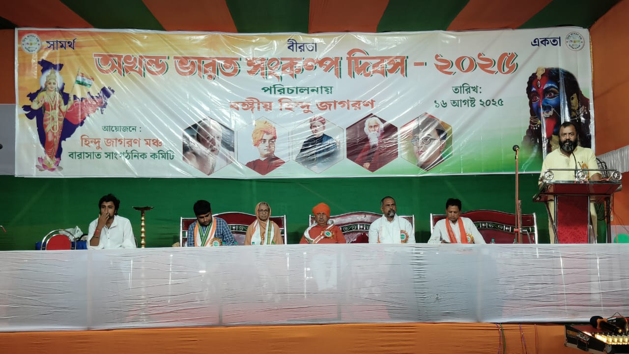 Dakshin Banga Hindu Jagran Manch (HJM) organized August 16 as Akhand Bharat Sankalp Diwas in various places in South Bengal. In Barasat (North 24 Parganas), Hindutva proponents Upananda Brahmachari, Rishi Dev, along with HJM leaders Ashutosh Mondal, Debashish Chakraborty, and Bikarna Naskar participated in the program.