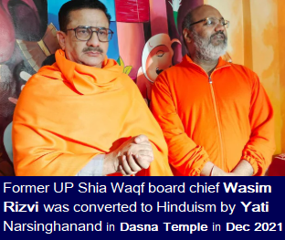 Notably, in December 2021, Yati Narsinghanand facilitated the conversion of Wasim Rizvi, the former chairman of the Shia Waqf Board, to Sanatan Hinduism through a religious ceremony at the Dasna temple in Ghaziabad. Following the Ghar Wapsi ceremony conducted by Yati Narsinghanand, Wasim Rizvi was renamed Jitendra Narayan Singh Tyagi.
