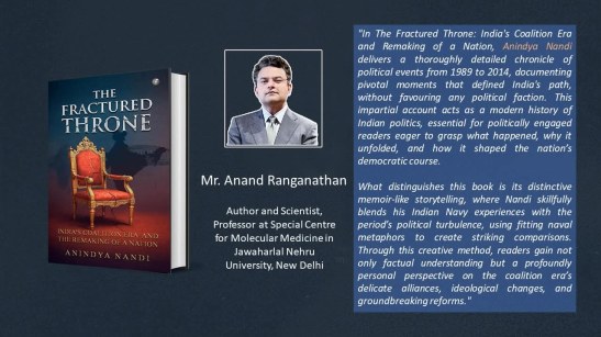“In The Fractured Throne: India’s Coalition Era and Remaking of a Nation, Anindya Nandi delivers a thoroughly detailed chronicle of political events from 1989 to 2014, documenting pivotal moments that defined India’s path, without favouring any political faction. This impartial account acts as a modern history of Indian politics, essential for politically engaged readers eager to grasp what happened, why it unfolded, and how it shaped the nation’s democratic course.