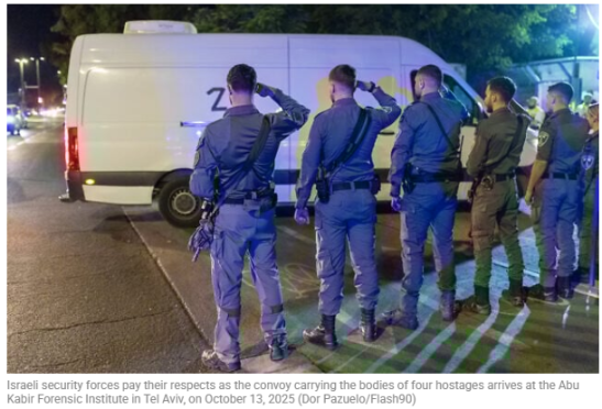 According to Israel Times, the bodies of the four hostages Hamas returned to Israel last night (13.10.2025) have been identified by forensic experts, and their families have been notified, the military says.