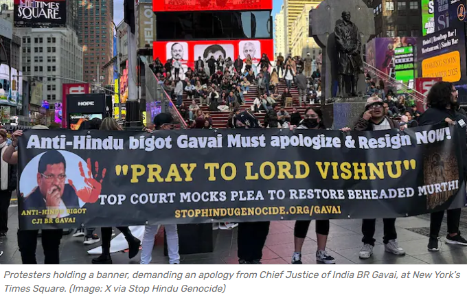 Upananda Brahmachari | HENB | New Delhi | Nov 12, 2025:: A group of Hindu diaspora members gathered at Times Square in New York City to express their outrage over recent remarks made by Chief Justice of India (CJI) BR Gavai. During a Supreme Court hearing on September 16, CJI Gavai reportedly suggested that a petitioner seeking restoration of a historic Bhagwan Vishnu idol at Khajuraho’s Javari temple should “go and ask the deity itself to do something now.”