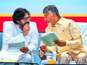 Andhra Pradesh Chief Minister N. Chandrababu Naidu and Deputy CM Pawan Kalyan during the NDA legislative party meeting, in Mangalagiri of Guntur district, Andhra Pradesh. (PTI Photo) Sept 18, 2024