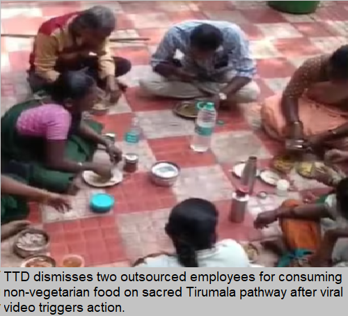 This incident follows another controversy earlier this month when two outsourced TTD employees were removed from service after a video surfaced on social media showing them allegedly consuming non-vegetarian food near Alipiri — a prohibited act within the hill’s proximity. Then a video widely shared on social media showed the staff eating meat on the steps leading to Tirumala.