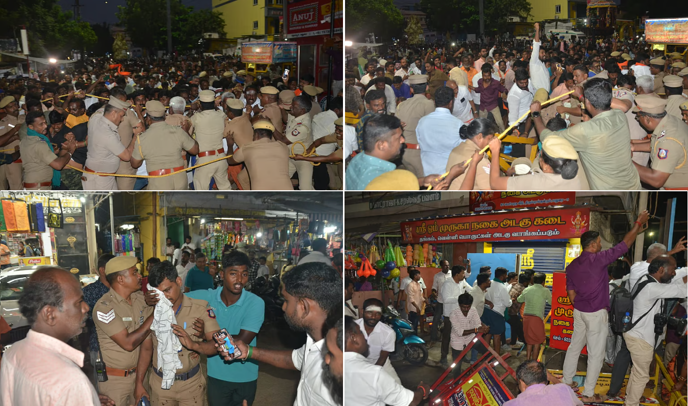 B Upendran | HENB | Madurai | Nov 4, 2025:: Clashes broke out between Hindutva activists and police in Madurai’s Thirupparankundram on Wednesday, December 3, as the activists attempted to force their way to the summit to light the Karthigai Deepam at the ‘Deepothoon’, a pillar located next to a Sufi dargah atop the hill. The activists, led by the BJP, Hindu Munnani, Hindu Makkal Katchi, RSS, and VHP, were prevented by the police, leading to a scuffle.