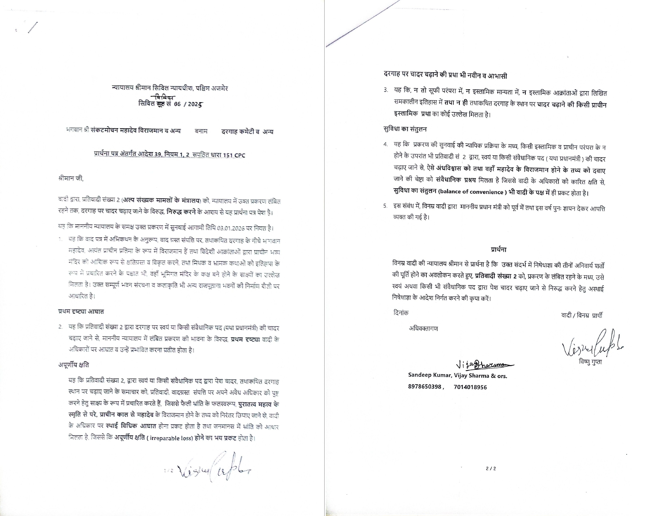 2. That the offering of a chaddar at the Dargah by defendant number 2, either personally or through a constitutional office (such as the Prime Minister), appears to be a prima facie infringement and prejudice to the rights of the plaintiff, contrary to the spirit of the case pending in the Hon’ble Court.