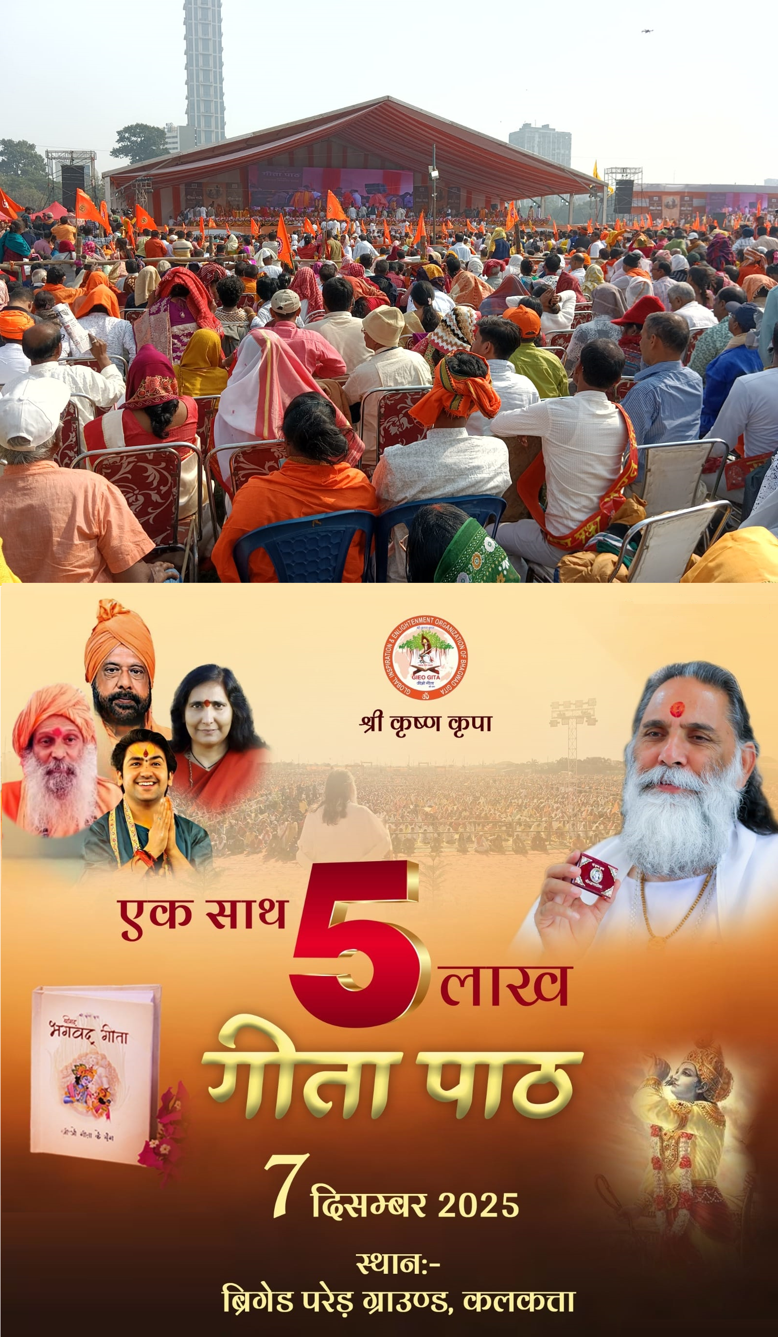 Sankirtan Das | HENB | Kolkata | Dec 7, 2025:: A massive gathering of around 500,000 people took place at Kolkata’s historic Brigade Parade Ground on Sunday, where the Bhagavad Gita was recited in unison. The event, organized by Sanatan Sanskriti Sansad, aimed to spread the essence of Sanatan Dharma and the universal messages of the Gita.