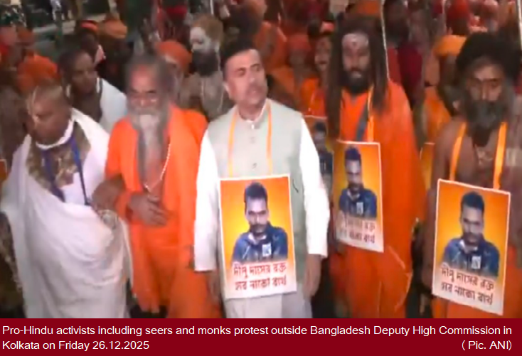 Demonstrations have been taking place outside the Bangladesh Deputy High Commission since December 22, 2025, over the killing of Dipu Chandra Das. On December 23, police used force against the protesters and arrested 19 people, including seven women. Mr. Adhikari said that hundreds of protesters, 1000 seers including 300 Naga monks (warrior clan of Dashnami sects), were present with him on Friday. He added that the protests would escalate in the coming days and stated that after the Gangasagar Mela next month, around five lakh sadhus would gather at the site, challenging the capacity of the Kolkata Police to manage such a large mobilisation.