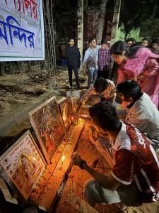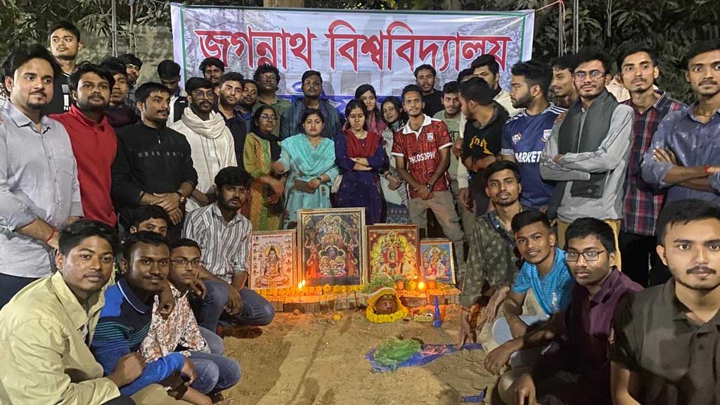 Students gathered at the university’s open-air stage at around 12 p.m., chanting slogans asserting their right to religious practice and criticizing what they described as the administration’s disregard for Hindu students’ concerns. The sit-in continued until approximately 10 p.m., after which the students brought pictures and idols of Hindu deities and puja materials to the disputed site and declared the inauguration of the “Jagannath University Central Temple.”