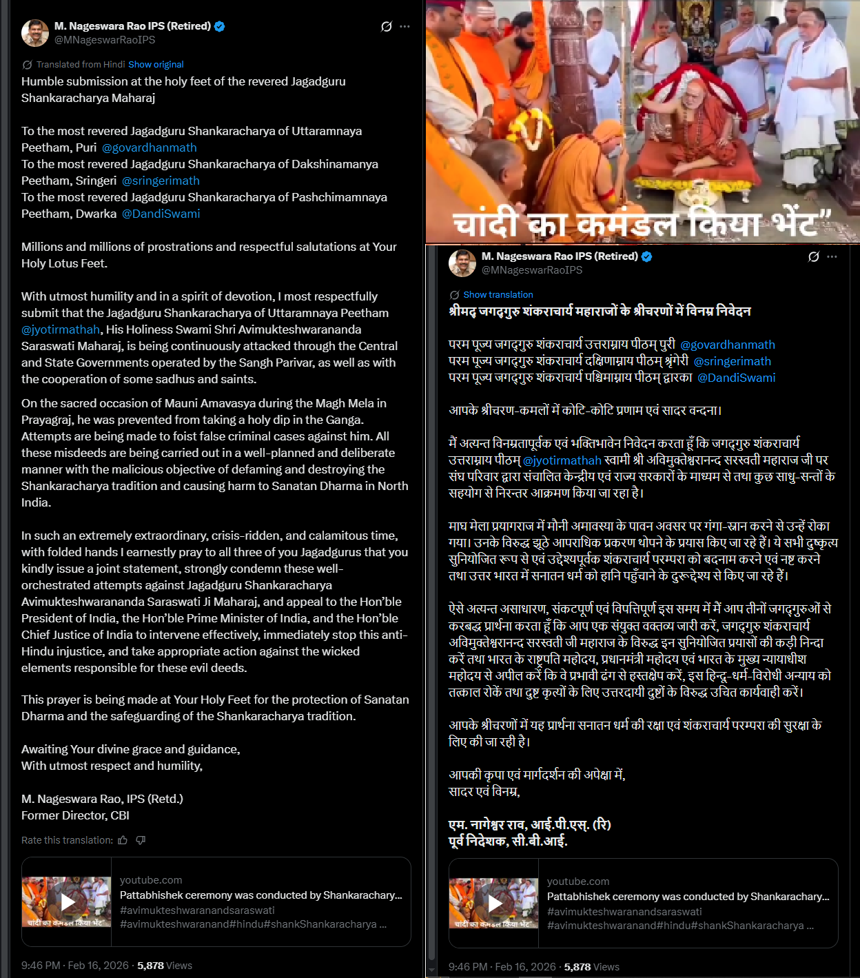 In the same post, Rao attached a video showing the Shankaracharya of Sringeri, Sri Bharati Tirtha Mahaswamiji, conducting the Pattabhishek (holy coronation/consecration) of Swami Avimukteshwarananda for Jyotir Math and of Swami Sadananda for Dwarka Peeth, presenting it as evidence of traditional recognition.