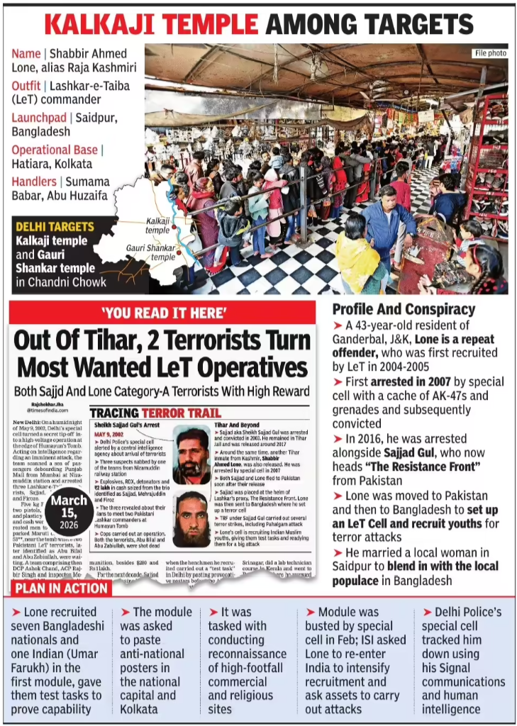 Upendra Bharti | HENB | New Delhi | March 31, 2026:: In a major breakthrough for India’s counter-terror apparatus, the Delhi Police Special Cell has arrested a “most wanted” Lashkar-e-Taiba (LeT) operative, Shabbir Ahmed Lone alias Raja Kashmiri, exposing a chilling cross-border terror network that allegedly planned attacks on prominent Hindu religious sites, including Delhi’s Kalkaji Temple.