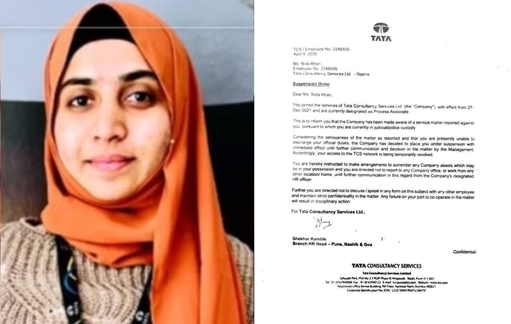 Accused Nida Khan, who was initially described as an HR head and later as a teleseller at the TCS Nashik BPO unit, has been suspended by the company forthwith.