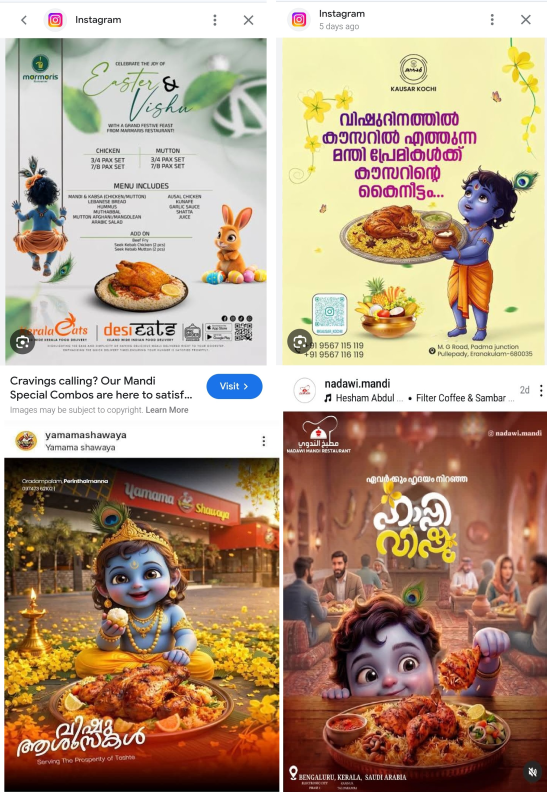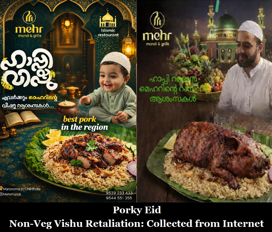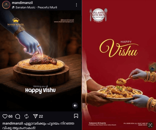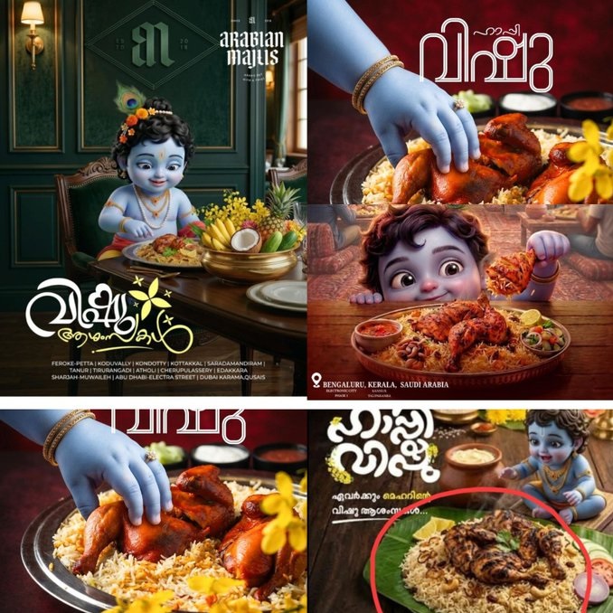 In this context, recent instances in which promotional materials depicted Lord Baby Krishna alongside non-vegetarian dishes have drawn criticism from a large section of Hindu community, who view such portrayals as inappropriate and offensive as perpetrated by Muslim restaurants/food-outlet owners. While some have questioned whether these incidents indicate a deliberate attempt to provoke religious sentiments in an organised way, authorities have not established evidence of any coordinated intent and continue to investigate each case individually. Now it is clear that certain anti-Hindu groups planned to hurt Hindu sentiments in Perinthalmanna, Ernakulam, Malappuram, Alappuzha, Mankada, and the surrounding areas during the Vishu festival through Muslim-owned food marts, restaurants, and similar establishments.